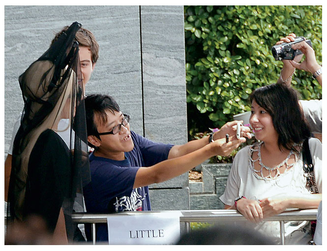Gaga se dejaba ver con un vestido negro de una manga de la colección de invierno 2012/13 de Osman. Como complemento, llevaba sobre la cabeza una diadema de tres puntas con un velo negro, creación de Lara Jensen: